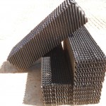 Specific cooling tower fill is used, depending on the water quality, temperature and cooling application and is designed to induce highly turbulent mixing of the air and water with a low pressure drop. High-efficiency cross corrugated fill constructed of pvc or polypropylene sheets is used to ensure maximum thermal capacity. In the case of high levels of suspended solids, a vertical fluted (splash tube) fill is used for industrial applications to ensure optimum thermal performance.